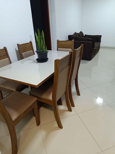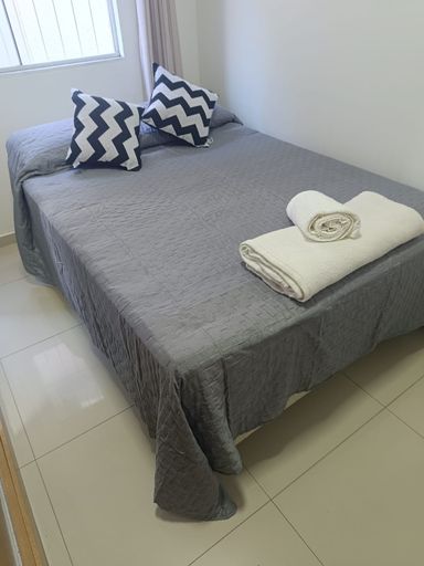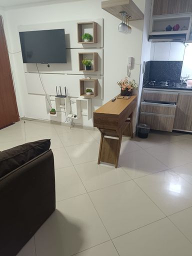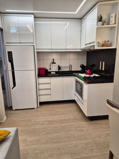 Apartamento de 73m² mobiliado com 2 quartos, sendo 1 suíte, banheiro, sala e cozinha integrados e 1 vaga de garagem.