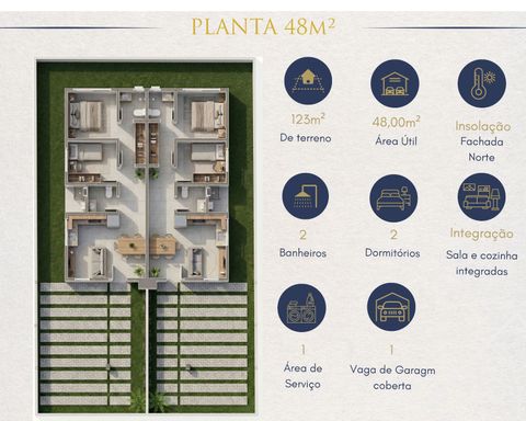 Casa térrea com 2 dormitórios sendo 1 suíte, banheiro social, sala e cozinha em conceito aberto, lavanderia e vaga de garagem.