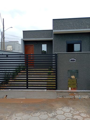 O imóvel conta com dois quartos, um banheiro, cozinha e sala ampla integrados, garagem coberta e pátio/jardim no entorno da casa.