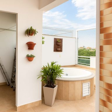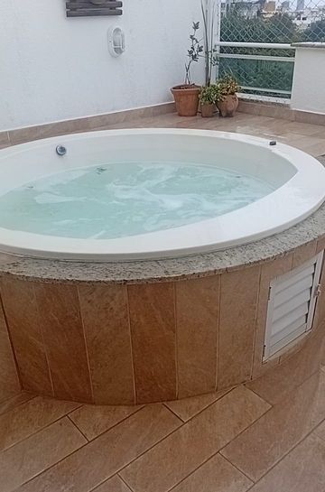 Terraço com churrasqueira, home-office e/ou depósito, e uma bela Jacuzzi.