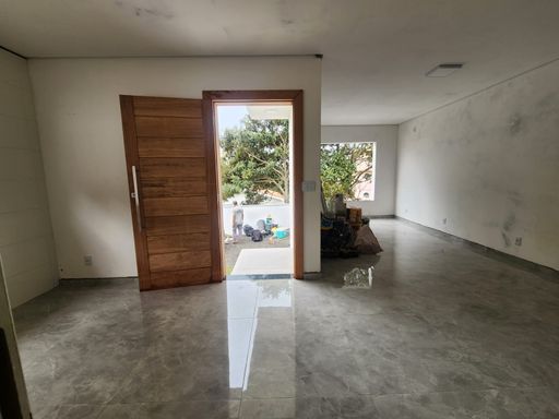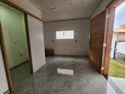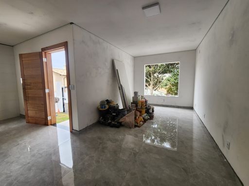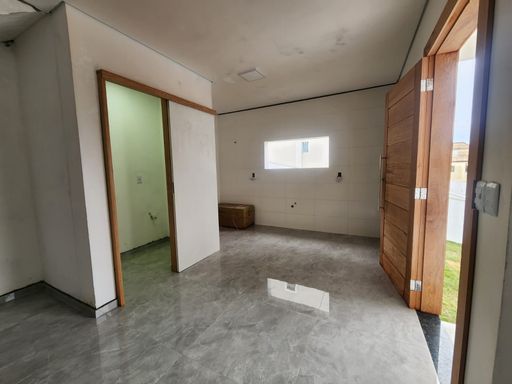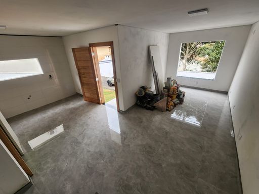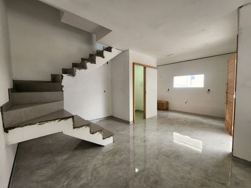 Sobrado com 2 dormitórios, sala e cozinha integradas, área de serviço externa, 2 banheiros, sendo um lavabo no terraço.