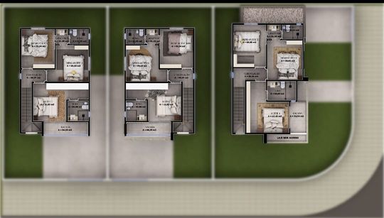 Térreo: Sala de estar, sala de jantar/cozinha, lavabo, churrasqueira, pátio, vaga de garagem para 2 carros.
