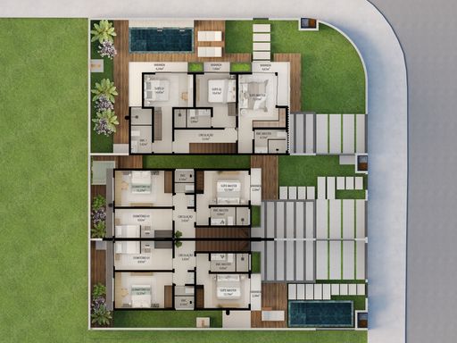 Inclui banheiros, lavabos, suítes e demi-suítes