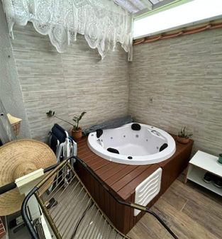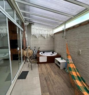Piso térreo: Sala de estar, sala de jantar/cozinha, lavabo, área gourmet com churrasqueira, hidromassagem, lavanderia e vaga de garagem