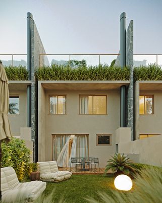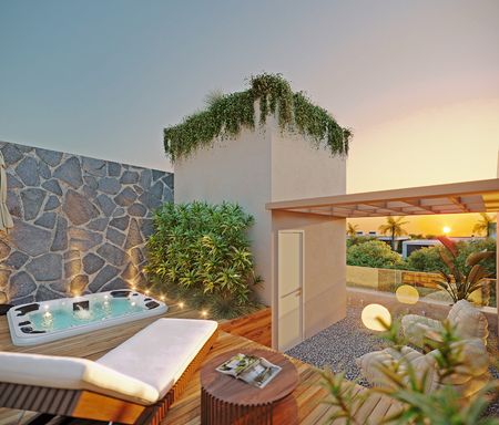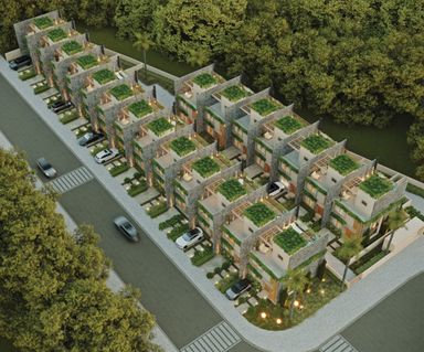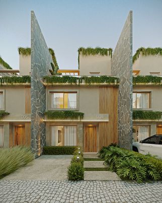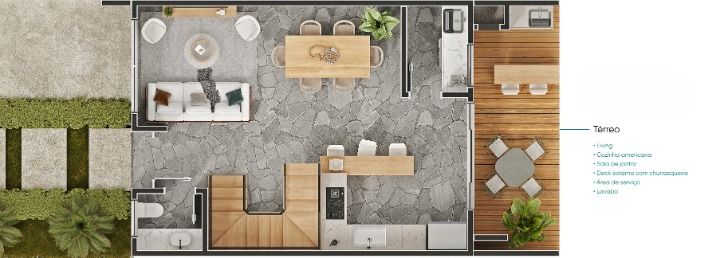 Cozinha americana, varanda gourmet, revestimentos naturais, possibilidade de spa, terraço com pergolado, estacionamento privativo. Algumas unidades com jardim gramado e Vagas para visitantes.
