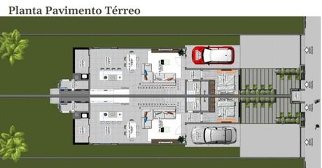 Pavimento térreo: sala e cozinha em conceito aberto, lavanderia, uma suíte, churrasqueira e um amplo quintal.