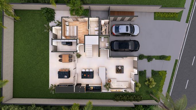 duplo. Cozinha com ilha e móveis sob medida e sala de jantar em conceito