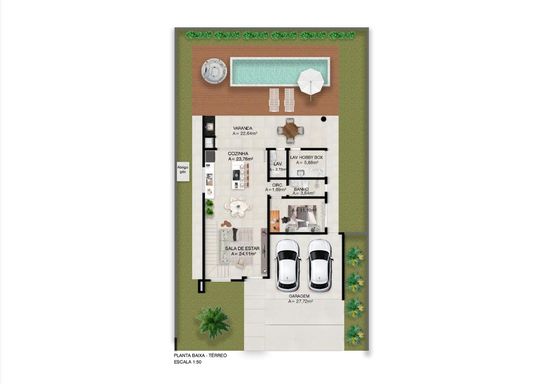 Sobrado Piso térreo - Sala de estar, cozinha, 1 dormitório, banheiro social, lavabo, lavanderia, varanda gourmet, piscina e vaga de garagem