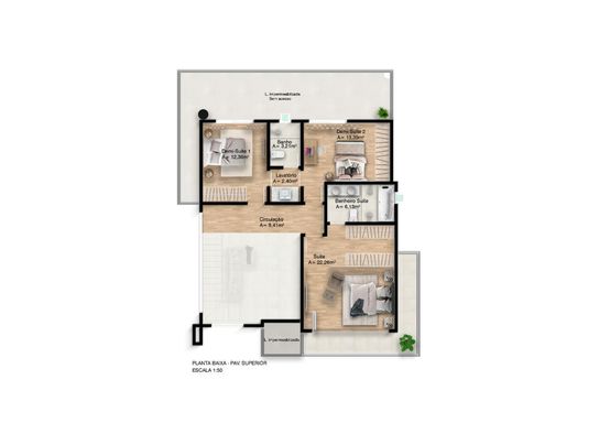 Piso superior - 2 dormitórios sendo demi suíte - 1 suíte master